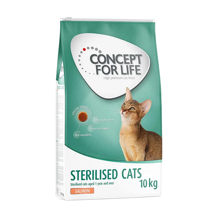 Concept for Life Sterilised Cats is specifically developed for adult cats after neutering. Sterilised cats often have a reduced energy requirement and increased appetite, which can lead to weight gain if not properly managed.