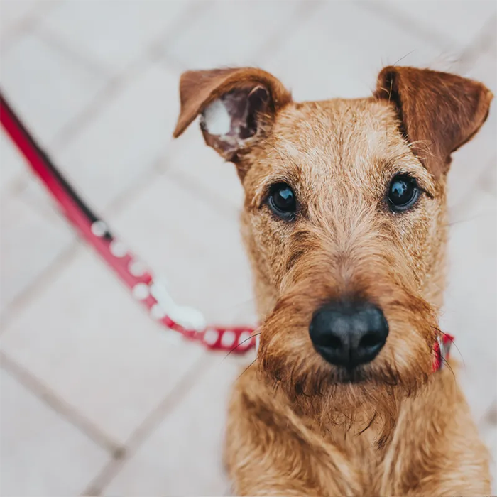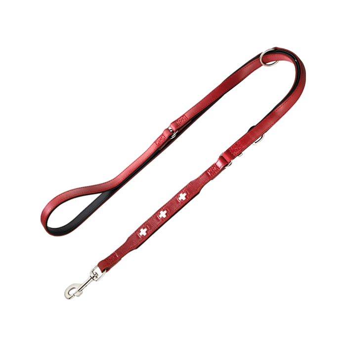 The leash is adjustable in three lengths thanks to integrated D-rings and an additional carabiner, offering flexibility for different walking situations. Its distinctive Swiss-style design with red leather and white cross stitching gives it a unique and elegant appearance.