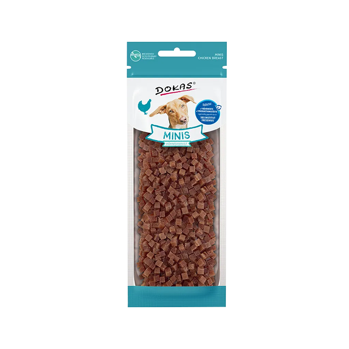 Dokas Minis Chicken Breast Dog Treats are specially designed for training and rewarding dogs. These extra small cubes are easy to handle and perfect for frequent rewards without overfeeding.
