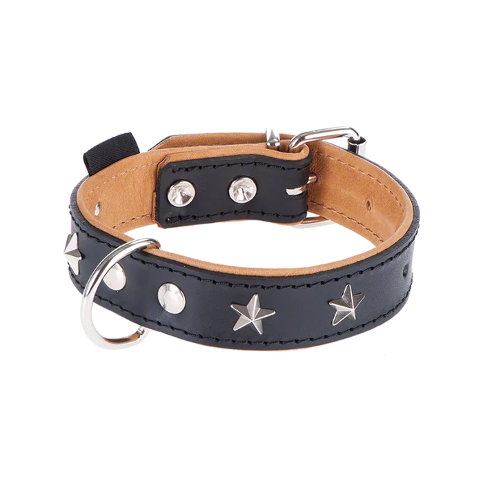 Stylish leather dog collar with soft lining and star design for comfort and durability.
