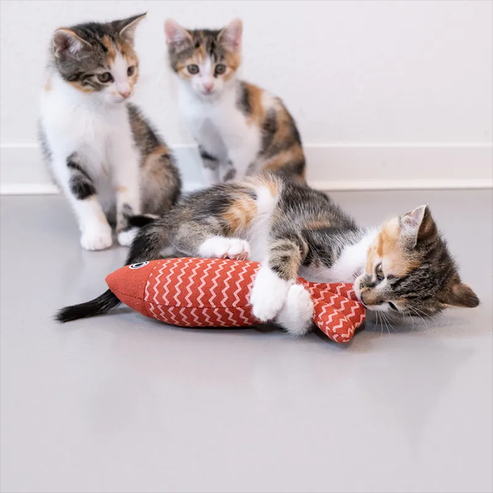 Modern Living Cadaques Fish Cat Toy is a soft plush toy designed to engage both adult cats and kittens. Its fish shape and ideal size make it perfect for grabbing, kicking and interactive play.