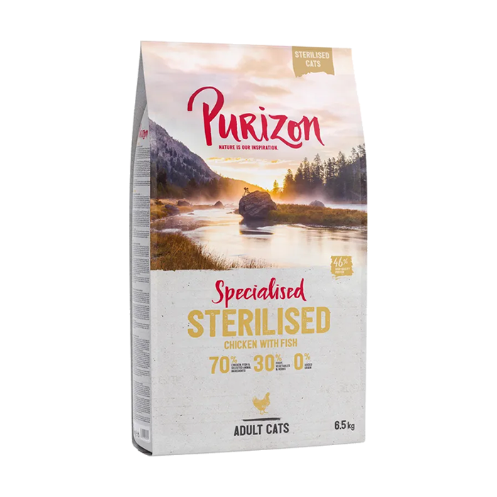 Purizon Sterilised Chicken & Fish Grain-Free Dry Cat Food is specially developed for sterilised cats, whose energy needs are typically lower while their appetite may increase. The recipe is designed to help maintain an ideal body weight while still providing all essential nutrients.