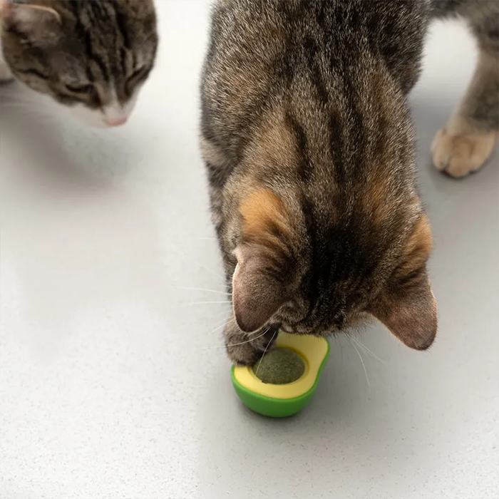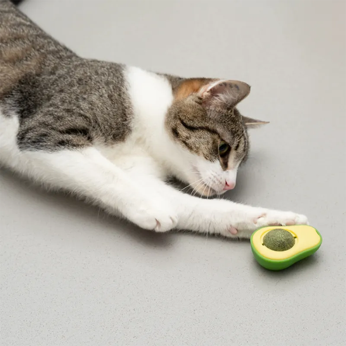 Compact avocado-shaped cat toy with removable catnip ball, designed for play and hunting stimulation.
