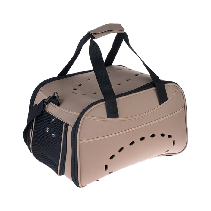 The carrier features a foldable construction with side zippers for easy storage. A mesh front panel ensures proper ventilation, while the padded handle and adjustable shoulder strap provide comfortable carrying options.