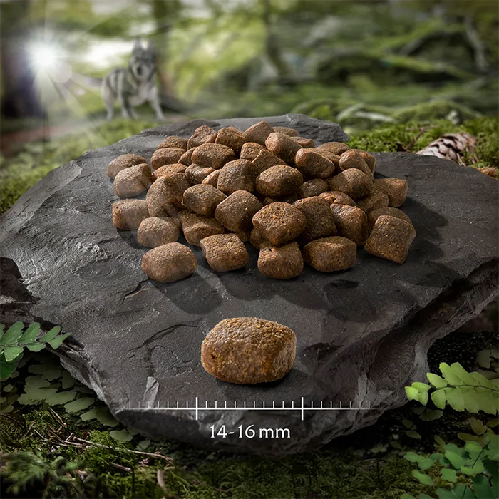 Soft-textured grain-free dry dog food with fresh beef and chicken, inspired by the natural diet of wolves and designed for adult dogs.