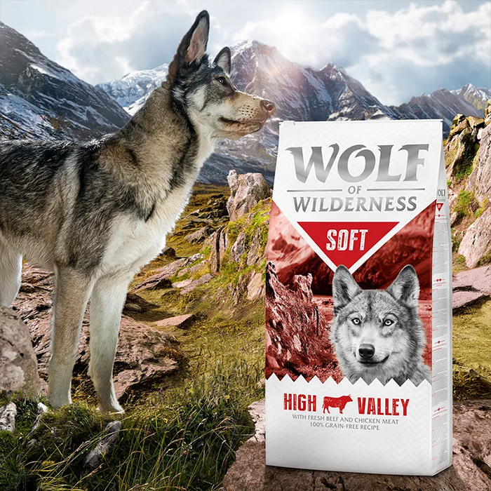 Wolf of Wilderness Soft High Valley Dry Dog Food is a semi-moist premium recipe inspired by the natural diet of wolves. This adult dog formula features fresh beef and fresh chicken, delivering high-quality animal protein in a soft-textured kibble that many dogs find especially appealing.